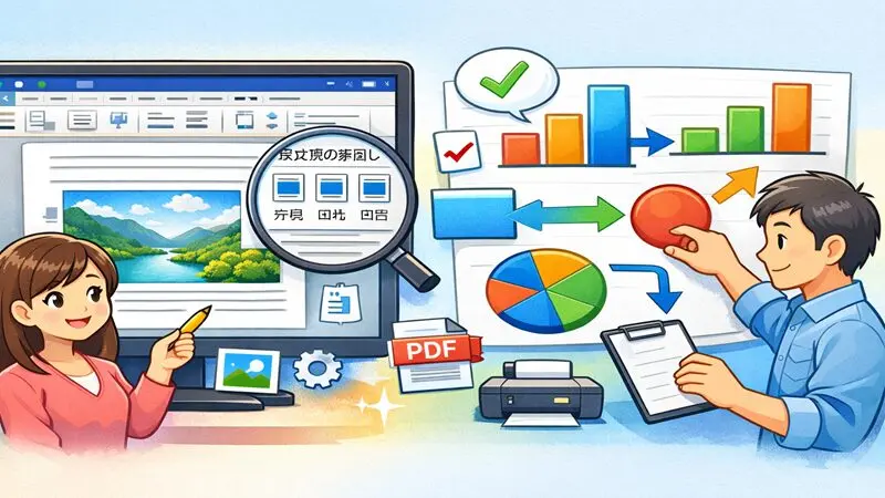 文字列の折り返し、配置基準、図形の整列やグループ化といった基本を押さえることで、文書の見やすさと完成度は大きく向上します。