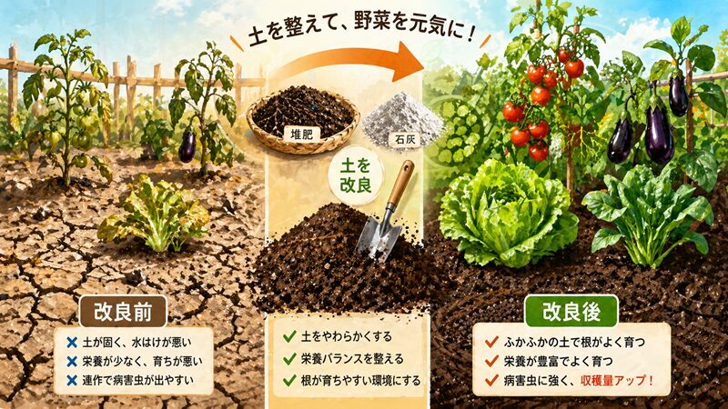 土地改良とは、土の通気性・排水性・保水性・栄養バランスを整えることを指し、いわば“野菜の住環境を整える作業”です。